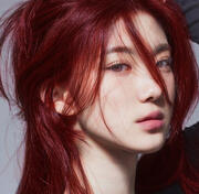 ↪︎ CARACTERÍSTICAS FÍSICAS: Cabelos levemente ondulados - Cor rubi (vermelho escuro); Olhos afiados e cansados - Em uma mescla de cores roxo e vermelho claro; Pele branca, quase pálida; Uma grande marca preta em seu braço direto, feita em uma batalha com sua melhor amiga Stella.